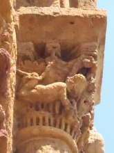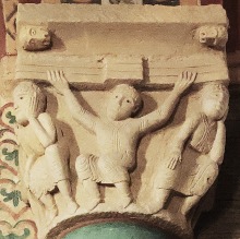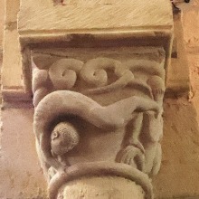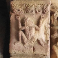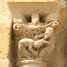 | Acrobate et serpents ひとりの裸の男が仰向けの姿勢で柱頭の縁にしがみついています。この人物は胸と足を2匹のモンスターのようなヘビに咬まれています。ヘビの尾は螺旋を描き互いに絡み合っています。 専門家の多くは、この場面を「悪の力と戦う人間」の寓意、又は「ヨナと巨大魚(或いはクジラ)」の場面を表したものと解釈しています。 Un homme nu, représenté la tête en bas, s'agrippe des mains à l'astragale du chapiteau. Il est mordu à la poitrine et aux pieds par deux serpents monstrueux dont les queues, en spirale, s'entrelacent. Selon plusieurs spécialistes, il s'agirait soit de la représentation de l'homme luttant contre les forces du mal, soit d'une évocation de Jonas et du gros poisson. |