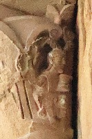 Corbeaux リンテルを支える2つの持ち送りにはアトランテが描かれています。このうち左の持ち送りのアトランテの左側の面にはロバの姿もあります。 Les deux corbeaux soutenant le linteau figurent des atlantes, dont celui de gauche est accompagné d'un âne, sculpté sur la face occidentale. |