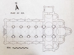Plan de l'église 東向きに建てられた教会堂は、ラテン十字型のプランを採用しています。教会堂はそれぞれ5ベイからなる三身廊、張り出したトランセプト、両脇に側廊を備え東側にアプスがある内陣で構成されます。 後陣はクリュニーUに着想を得た、ベネディクト・スタイルと呼ばれるプランを見せ、内陣は5つの階段状に配された5つの後陣祭室に囲まれます。うち2つの後陣祭室は翼廊に接し、もう2つの祭室は内陣の側廊の東側に位置し、最後のひとつの小さな祭室はアプスの延長線上にあります。 建物全体の構成は、シャルリューの修道院教会のプランとほぼ同じです。 L'église, orientée, adopte un plan en croix latine. Elle se compose de trois nefs de cinq travées, d'un transept débordant et d'un choeur à abside flanqué de deux collatéraux. Le chevet offre un plan de type bénédictin, inspiré de celui de Cluny II : l'abside est entourée de cinq chapelles échelonnées - deux absidioles greffées sur les croisillons, deux autres prolongeant les collatéraux, et enfin une petite absidiole d'axiale dans le prolongement de l'abside du choeur. L'ensemble du dispositif architectural est presque identique au plan de l'abbatiale deCharlieu. |