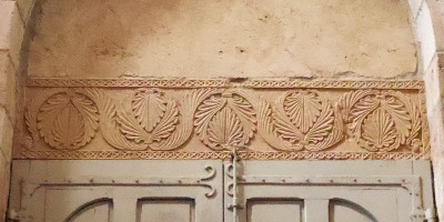 リンテルの裏側は、葉と唐草モティーフの装飾が施されています。唐草モティーフは角に描かれた2人の人物の口から吐き出されています。 Le revers du linteau présente un décor de rinceaux feuillus, crachés par la bouche de deux petites têtes humaines placées aux angles. |