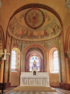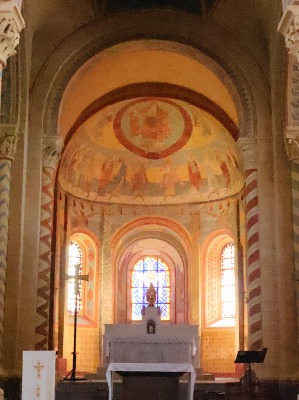 | Fresques de l'abside et des absidioles アプスとアプスを取り囲む後陣祭室は、12世紀に制作されたロマネスクのフレスコ画で装飾されています。これらの壁画は1850年に漆喰の下から発見され、1857年に修復され、一部大幅な描き直しも行われ、そして2017年に改めて再度修復されました。 L'abside et les trois absidioles qui l'entourent sont ornées de fresques romanes du 12e siècle. Redécouvertes sous un badigeon en 1850, elles ont été restaurées - parfois même largement reprises - en 1857, puis à nouveau restaurées en 2017. |