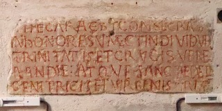 | Inscription de l'autel 内陣に設置された近代の主祭壇の裏側には、11世紀末に刻まれたラテン語の銘があり、これは19世紀に発見されました。銘文は教会の奉献に関するもので、「至高にして不可分なる三位一体に、尊き十字架に、神の聖母にして処女マリアに」とあります。 Derrière le maître-autel moderne du choeur se trouve une inscription latine de la fin du 11e siècle, redécouverte au 19e siècle, relative à la dédicace de l'église : à la très haute et indivisible Trinité, à la vénérable Croix et à la Sainte Mère de Dieu, la Vierge Marie. |