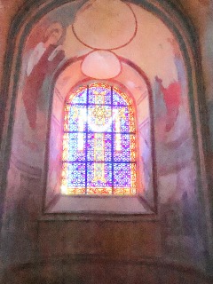 Absidiole axiale アプスの東側にある小さな中央後陣祭室には、半円型の開口部がひとつ穿たれています。この祭室の配置は珍しいものです。また、開口部の周りには動物が描かれています。 Prolongeant l'abside, la petite absidiole axiale, disposition rare, est percée d'une baie en plein cintre, encadrée de peintures représentant des animaux. 中央後陣祭室の壁画は、聖ベネディクトゥス及び聖マウルスの生涯、聖マウルスが聖ベネディクトゥスに奉献される場面、聖ゲルマヌスが聖ベネディクトゥスに顕現する場面が観察されます。 4つの場面の上には、2人の聖人と2人の天使が描かれています。 ヴォールトには三位一体の鳩が描かれています。 Les peintures murales de l'absidiole d'axe illustrent la vie de saint Benoît, celle de saint Maur, l'oblation de saint Maur à saint Benoît, ainsi que l'apparition de saint Germain à saint Benoît. Au-dessus de ces quatre scènes sont figurés deux saints et deux anges. Sur la voûte apparaît la colombe de la Trinité. |