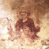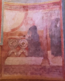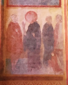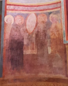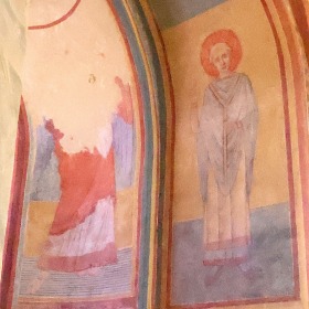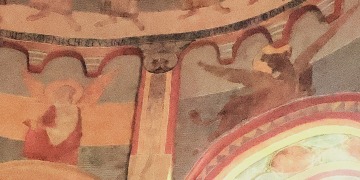 アプスの入り口付近には、丈の短いチュニカを着て、首を垂れて祈るような姿勢をしている2人の人物が描かれています。 A l''entrée de l'abside sont visibles deux personnages vêtus de tuniques courtes, la tête inclinée dans une posture évoquant la prière. |