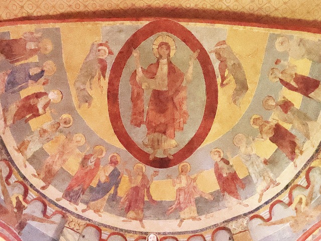 | アプスのセミ・ドームの壁画は、キリスト昇天を描いており、2人の天使に囲まれてマンドルラの中でキリストが祝福を施しています。キリストの足元には、12使徒と3人の聖女の姿があります。 |