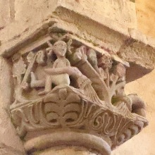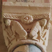 | 右の柱頭は、解釈が非常に困難ですが、一人の人物が頭・手首・足首を縄で縛られ宙づりにされており、もう一人の人物は自分の喉に短剣を突き刺しています。 Sur le chapiteau de droite, dont l'interprétation demeure délicate, un personnage est suspendu dans les airs, la tête, les poignets et les pieds liés par une corde, tandis qu'un autre s'enfonce un poignard dans la gorge. |