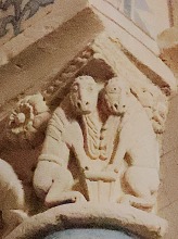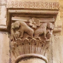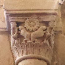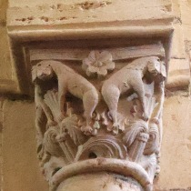 Lions affrontés 身廊には向かい合ったライオンを描いた柱頭が複数あります。 この柱頭では、ライオンは前脚を人間の頭の上に置いています。 La nef compte plusieurs chapiteaux figurant des lions affrontés. Sur celui-ci, les deux lions posent leur patte sur une tête humaine. |