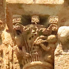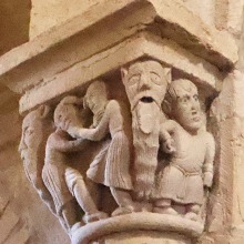 Combat des vieillards この柱頭は怒りという悪徳を表現しています。 正面では2人の顎髭を生やした老人が、互いの髭と髪を掴んで取っ組み合っています。 両角には、長い顎髭を生やし尖った耳を持つ悪魔のような顔が彫られていて、舌を突き出しています。 左側の面では、2人の男或いはサルが抱き合っており、右側の面には、怒った男の姿があります。 Ce chapiteau illustre le vice de la colère. Sur la face principale, deux vieillards barbus s'empoignent par la barbe et les cheveux. Aux angles, des masques diaboliques, à la barbe démesurément longue et aux oreilles pointues, tirent la langue. Sur la face gauche, deux hommes ou singes s'embrassent, tandis que sur la face droite se tient un homme en colère. |