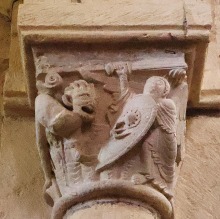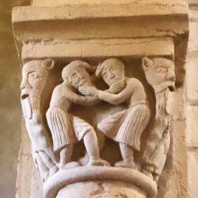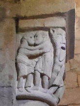 Chapiteaux sculptés ヴシュールを支える2つの柱頭には非常に暴力的な場面が描かれています。 Recevant la voussure, deux chapiteaux figurent des scènes d'une grande brutalité. 左側の柱頭では、2人の人物が取っ組み合っています。一人は身をかがめて右手に球のようなもの(恐らく石)を掴み、もう一人は彼の髪を掴んで殴りつけています。 この柱頭は、しばしばイサクの燔祭の場面を表現していると解釈されます。しかしアブラハムの腕を掴んで押しとどめる天使の姿も、イサクの代わりとなる筈の雄羊の姿もありません。 Sur le chapiteau de gauche, deux personnages s'affrontent : l'un, penché vers le sol, tient dans sa main droite une sorte de boule (peut-être une pierre), tandis que l'autre le saisit par les cheveux et lui assène un coup. Ce chapiteau est souvent interprété comme la scène du sacrifice d'Isaac. Toutefois, aucun ange ne retient le bras d'Abraham, et aucun bélier destiné à remplacer Isaac n'y apparaît. |