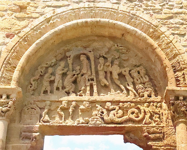 | リンテルは最後の審判を表現しており、選ばれし者と地獄に落とされた者とを選り分ける場面が描かれます。 左端では、選ばれし者達が、小さな建造物で表現された天上のエルサレムに迎え入れられています。彼らの前で、翼を広げた天使が、悪魔が連れ去ろうとしている人物を押し戻しています。 右端では、別の翼を広げた天使が地獄に落とされた者達を連れています。その中には、膝をついて天使に懇願している人物もいます。彼らの傍では、レヴィアタンが地獄の炎の上で身をくねらせています。断罪された者達を貪り食いながら、このモンスターは背中に悪魔を乗せており、その悪魔は他の罪人達の魂を首に鎖で繋いで引っぱっています。 |