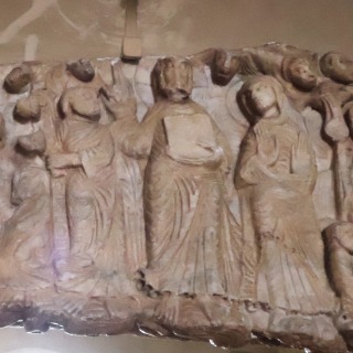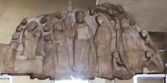 | 身廊の最初のベイに設置されている白大理石製のロマネスクのタンパンは、1930年代に教会堂の拡張工事の最中に発見されました。今日失われてしまっている教会堂の旧北入り口を飾っていたものと考えられています。 タンパンは「フランス歴史的記念物(Monuments Historiques/MH)」に格付けされています。 Installé dans la première travée de la nef, ce tympan roman en marbre blanc a été mis au jour dans les années 1930, lors des travaux d'agrandissement de l'église. Il proviendrait de l'ancien portail nord de l'église, aujourd'hui disparu. L'oeuvre est désormais classée au titre des monuments historiques (MH). |