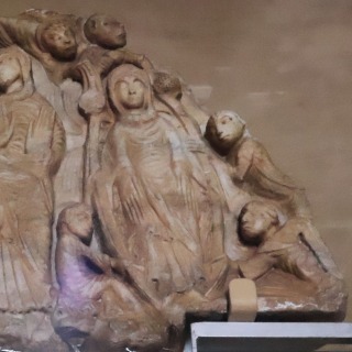 Partie gauche : la résurrection de la Vierge タンパン左部分は、聖母マリアの復活を表現しています。 マリアがイエスによって墓から引き上げられています。2人の両脇で、2人の使徒が跪いています。左がヨハネ、右がペテロです。この場面の周りには複数の天使の姿があります。 La partie gauche du tympan illustre la résurrection de la Vierge Marie est soulevée du tombeau par son fils. A leurs côtés, deux apôtres sont agenouillés : saint Jean à gauche, saint Pierre à droite. Plusieurs anges entourent la scène. |