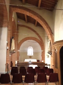 身廊には南側に、半円型の大アーケードで隔たれた側廊があります。この南側廊も木造天井で覆われ、各ベイに装飾がない半円型の開口部が3つ設けられています。側廊の東端には、小さな半円型の開口部から採光する後陣祭室があります。 La nef est flanquée au sud, d'un bas-côté, séparé par de grandes arcades en plein cintre. Ce bas-côté méridional, couvert lui aussi de la charpente, est percé de trois baies en plein cintre sans décor. Il s'achève par une absidiole éclairée par une petite baie en plein cintre. |