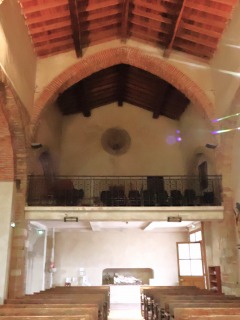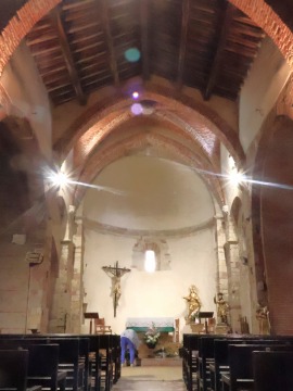 教会堂は身廊、南側廊(東端に後陣祭室)、半円プランのアプスで構成されます。 L'église se compose d'une nef principale, accompagnée au sud d'un bas-côté sud se terminant par une absidiole, ainsi que d'une abside en hémicycle. 身廊は3ベイからなり、木造天井で覆われています。身廊の最初のベイにはギャラリーがあります。身廊に高窓はありませんが、最後のベイで脇のアーケードの上にオクルスが穿たれています。 半円プランのアプスはセミ・ドームで覆われ、装飾がない隅切りが施された半円型の小さな開口部から採光します。 La nef comprend trois travées couvertes de la charpente. La première travée est surmontée d'une galerie. Aucune fenêtre haute n'éclaire la nef ; toutefois, la dernière travée est percée d'oculi au-dessus des arcades latérales. L'abside hémicirculaire en cul-de-four reçoit la lumière par une petite baie ébrasée en plein cintre dépourvue de décor. |