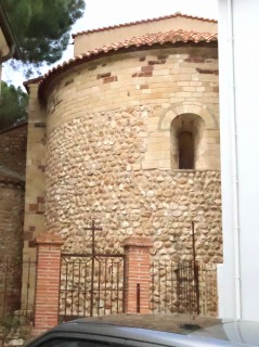 Façade septentrionale 教会堂は特に西と北、東側を隣接する建物に囲まれているため、全体を観察することはできません。それでも鐘楼は身廊の北側に、小鐘塔は東ファサードの上にあるのが確認できます。 今日教会堂には北ファサードにある半円型の入り口からアクセスします。 Enserrée par les bâtiments adjacents, notamment sur les côtés ouest, nord et est, l'église ne se laisse pas bien admirer dans son ensemble. On distingue cependant le clocher situé au nord de la nef, ainsi que le clocheton couronne la façade occidentale. L'accès actuel à l'édifice se fait par une porte en plein cintre, aménagé sur la façade septentrionale. |