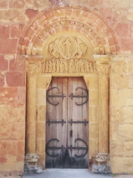 Portail occidental 西入り口は、この教会堂の至宝であり、12世紀初め、恐らく1120‐1125年頃に造られました。扉の鉄細工の装飾も、入り口と同じ時期に遡ります。 柱頭彫刻を戴く2つの円柱に囲まれた入り口には、ひとつの石で作られたタンパンとリンテルがあり、これは5層のヴシュールがある半円型のアーキヴォールトに囲まれています。 Le portail occidental, joyau de l'édifice, a été réalisé au début du 12e siècle, probablement entre 1120 et 1125. Les ferrures de la porte remontent à la même période. Encadré de deux colonnes aux chapiteaux sculptés et aux bases décorées de rinceaux, le portail présente un tympan et un linteau taillés dans un seul bloc de pierre, entourés d'une archivolte en plein cintre à cinq voussures. |