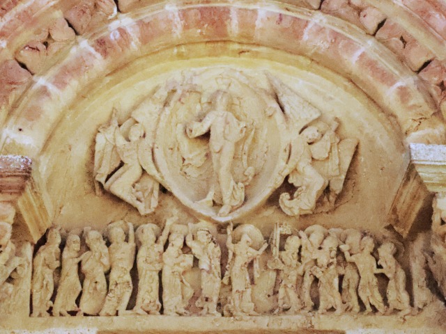 | タンパンは、キリスト昇天の場面を表現しています。十字のマークがあるニンブスを戴くキリストはマンドルラの中で右手で十字架を掲げるようにして持って立っており、翼を広げた2人の天使によって天に運ばれています。天使達はキリストに背を向けて描かれています。 リンテルでは14人のニンブスを戴いた人物が、様々な身振りで天を仰ぎながらキリストの昇天を讃えています。これらの人物は12使徒、聖母マリア、天使で、このうちペトロは大きなカギを持っていることでそれと識別できます。 |