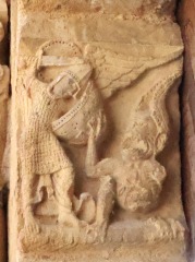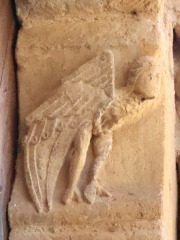 Corbeaux historiés タンパンとリンテルを支えるコーベルにも聖人伝が彫刻されています。 左側のコーベルは、ドラゴンと対峙する聖ミカエルを描きます。ミカエルは裸足で鎖帷子を身に着け、盾を持ち刀を振りかざしています。 右側のコーベルには、天使或いは人間の頭部をもつ空想上の鳥が描かれています。 Soutenant le tympan et le linteau, deux corbeaux sont également historiés. Le corbeau de gauche figure l'archange Michel terrassant le dragon. L'archange, pieds nus et vêtu d'une cotte de mailles, tient un bouclier et brandit une épée. Le corbeau de droite figure un ange ou un oiseau fantastique à tête humaine. |