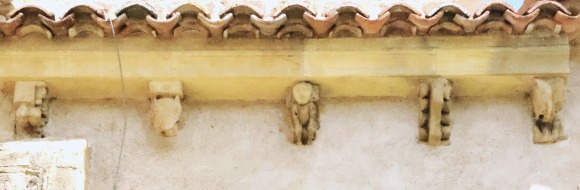 Modillons 内陣部分には、人物と空想の動物の頭部を彫刻したロマネスクのモディヨンが幾つか残っています。 La travée du choeur conserve quelques modillons romans, sculptés d'une figure humaine et de têtes d'animaux fantastiques. |