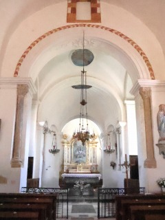 身廊は直接内陣に面していて、半円型のアーチ(いわゆる凱旋アーチ)で開かれています。このアーチは植物が彫刻された柱頭を冠する円柱に支えられています。 La nef s'ouvre directement sur le choeur par un arc triomphal en plein cintre porté par deux colonnes aux chapiteaux sculptés de feuillages. |