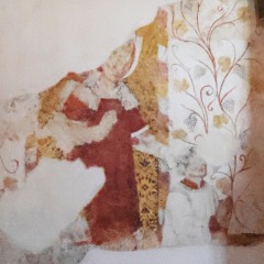 Choeur et abside 左は身廊から見た教会堂の東部分のイメージで、手前から順に内陣、アプス、18世紀の祭室と続きます。 奥行きの狭いロマネスクの内陣のベイは、元来はトロンプ技法によるクーポルに覆われていましたが、後に改修されています。 内陣の上には、方形の鐘楼が聳えます。 Le choeur roman, réduit, était à l'origine couvert d'une coupole sur trompes, ultérieurement remaniée. Au-dessus, s'élève le clocher roman de plan carré. ロマネスクの半円プランのアプスは元来セミ・ドームに覆われていましたが、1777年に領主の葬儀の祭室がその東側に増築され、アプスは改修されました。それでも両側壁に、小円柱に支えられた半円型の連続アーチが残ります。 アプスにも聖具室に繋がる扉の上に、福音記者ヨハネを描いた16世紀の壁画が残ります。 L'abside romane en hémicycle était primitivement voûtée en cul-de-four. Elle a été transformée en 1777 par l'adjonction, sur son côté oriental, d'une chapelle funéraire seigneuriale. Les murs latéraux conservent néanmoins des arcatures en plein cintre reposant sur des colonnettes. Au-dessus de la porte de la sacristie subsiste également une peinture murale du 16e siècle représentant saint Jean l'Evangéliste. |