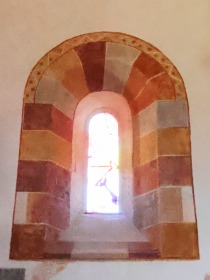 Nef 身廊は単身廊で3ベイからなり、円筒型のヴォールトで覆われています。このヴォールトは1900年頃(仏語解説では19世紀とされる)に再建されました。 ロマネスクの半円型の開口部には深い隅切りが施されています。開口部は2008年に制作されたステンドグラスで装飾されています。 La nef unique de trois travées, est couverte d'une voûte en berceau plein cintre, refaite au 19e siècle. Les baies romanes en plein cintre, fortement ébrasées, sont décorées de vitraux contemporains, réalisés en 2008. |