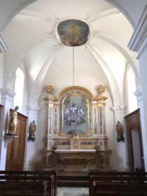 | Chapelle funéraire ロマネスクのアプスの東側にある2ベイの葬儀の祭室は、領主であったアベル・ド・ヴィシーによって1777年にバロック又は新古典主義スタイルで増築されました。祭室の装飾は1854年に遡ります。 この祭室は今日内陣として利用されています。 La chapelle funéraire de deux travées, dans le prolongement oriental de l'abside romane, a été construite en 1777 dans un style baroque ou néo-classique par le seigneur de lieu, Abel de Vichy. Sa décoration date de 1854. Aujourd'hui, la chapelle est utilisée comme choeur. |