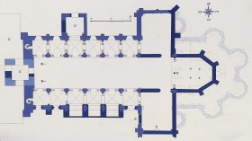 | Plan de l'église 教会堂は今日、ラテン十字プランで、6ベイの三身廊、張り出したトランセプト、内陣で構成されます。内陣の下にはクリプトがあります。 建物の西側には鐘楼ポーチが聳えます。また南側にはかつて回廊が広がっていました。 L'église actuelle adopte un plan en croix latine, composé de trois nefs de six travées, d'un transept saillant et d'un choeur polygonal. Une crypte se trouve sous le choeur. L'édifice est précédé d'un clocher-porche, et était jadis flanqué, au sud, d'un cloître. 全長60mを誇ったロマネスクの教会堂については、内陣は4つの半円プランの放射状祭室がある周歩廊に囲まれていました。クリプトはその上に建つサンクチュアリと同じプランでした。また翼廊には、東側にそれぞれ半円プランの後陣祭室がありました。 |