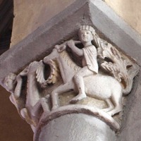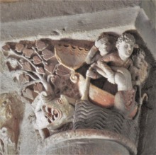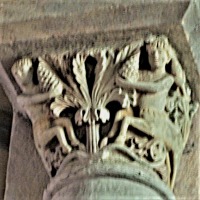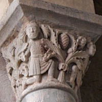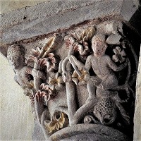 この柱頭はトビアとサムソンの2つの物語を描きます。 コーベルの中央に配された木の左側に、若いトビアが巨大な魚に馬乗りになっています。トビアはこの魚の肝臓と心臓、胆嚢が入った袋を握っています。 このテーマは旧約聖書のトビト記から引用されています。 木の右側では、顎髭を生やしたサムソンが、ライオンを倒しその顎を砕いています。 Ce chapiteau réunit à la fois l'histoire de Tobie et celle de Samson. Sur le côté gauche d'un arbre placé au centre de la corbeille, le jeune Tobie chevauche un énorme poisson. Il serre un sac renfermant le fiel, le coeur et le foie du poisson. Cette scène est tirée du Livre de Tobie, dans l'Ancien Testament. A droite de l'arbre, Samson, barbu, terrasse un lion et lui brise la mâchoire. |