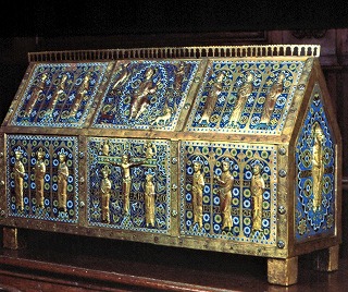 | 浮彫のない平らな背面には、聖カルミニウスと聖女ナマディアの生涯が展開され、この2人による3つの修道院(ル・モナスティエ・シュル・ガゼイユ、ラゲンヌ及びモザ)の創建の場面、夫妻の埋葬の場面、モザ修道院長、恐らくマルサックのペテロ3世によるモザ修道院の献堂の場面が描かれています。尚、この修道院長がこの聖遺物箱の制作を依頼しました。 | ||