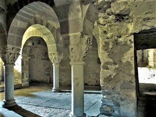 | 現存するクリプト、すなわちカロリング朝時代に遡るクリプト中央部分は、ローマ時代の石も再利用された堅固な壁に囲まれ、ヴォールトは植物モティーフが彫刻された柱頭を冠する円柱に支えられています。 |