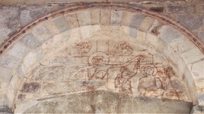 | Linteau de l'Hommage 南翼廊の西側にある入り口は、かつて回廊に面していました。現在は塞がれていますが、外側には山型のリンテルがタンパンの中に埋め込まれています。12世紀初頭に制作されたこのリンテルには、今も多彩色の痕跡が認められます。 |