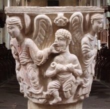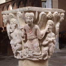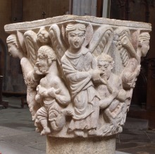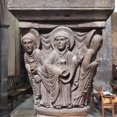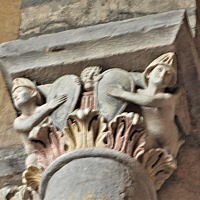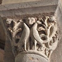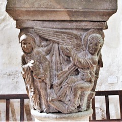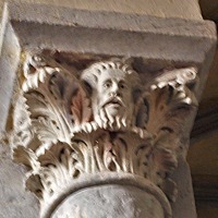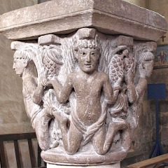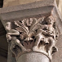 | 旧内陣の湾曲部の8つの円柱を飾っていた柱頭のうち、5つが発見されており、このうち3つは教会堂内部で展示されています(2つが身廊の西側、1つが内陣)。 もうひとつ、1914年以前に発見されたより損傷が見られるアトランテを描いた柱頭があり、これは修道院の石材の展示スペースにて保管されています。 5つめは四つの福音書を表現した柱頭(4人の天使が四福音書の冒頭のフレーズが刻まれたフィラクテールを手にしている)で、これは現在ロンドンのヴィクトリア・アンド・アルバート博物館に所蔵されています。 |