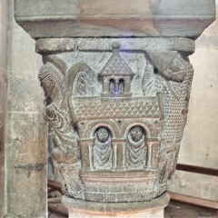| この柱頭は、キリスト復活を表現しています。 キリストの墓は、小鐘楼を戴く建物として描かれています。墓の右側で、3人の衛兵が居眠りしています。衛兵は12世紀の兵士のような装いをしています。3人の聖女が香油の入ったアンフォラを抱え、イエスの身体に香油を塗るため墓にやって来ます。墓に凭れて座っている天使は右手で空になった墓を指し示し、聖女達にキリストが復活したことを告げています。 |