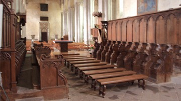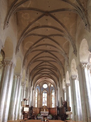 Croisée du transept 1410年に制作された木製の聖職者席が設置されたトランセプト交差部は、現在オジーヴ・ヴォールトで覆われています。 ロマネスクの教会堂については、交差部はトロンプ技法によるクーポルに覆われ、その上には外側に八角形プランの鐘楼が聳えていました。 Renfermant les stalles en chêne datant du 1410, la croisée du transept est aujourd'hui voûtée d'ogives. Quant à celle de l'édifice roman, elle était alors couverte d'une coupole sur trompes, surmontée à l'extérieur d'un clocher octogonal. |