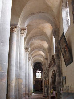 | Vestiges et restitution de la tribune nord 北側廊の側壁の上、西側に、柱頭彫刻を戴く小円柱に支えられた半円型の小さな連続アーチが見えます。これは15世紀の一連の地震の後に失われた、北側廊上のトリビューンの外側の連続アーチを部分的に復元したものです。元来このアーチは側廊全体にわたって設けられていましたが、19世紀に行われた復元工事は完遂されませんでした。 Au-dessus du mur gouttereau du bas-côté nord, vers l'ouest, sont visibles des arcatures en plein cintre reposant sur des colonnettes aux chapiteaux sculptés. Elles constituent une reconstitution partielle de l'arcature extérieure de la tribune qui dominait autrefois le bas-côté nord, disparue à la suite des tremblements de terre du 15e siècle. Les travaux de rétablissement entrepris au 19e siècle sont demeurés inachevés : à l'origine, l'arcature couraient sur toute la longueur du bas-côté. トリビューンの半円筒型のヴォールトは、中央身廊の円筒型ヴォールトを支えていました。このことから、ロマネスクの教会堂は現在の教会堂よりも、恐らく4・5メートル高かったと考えられます。 La voûte en demi-berceau de la tribune contrebutait celle, en berceau, de la nef principale, ce qui laisse supposer que l'église romane était plus élevée que l'édifice actuel, probablement de 4 ou 5 m. |