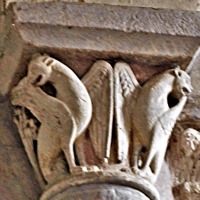 | この柱頭は、預言者ヨナの物語を描きます。 右側では、3人の船員のうちのひとりが、裸のヨナを船縁から海に投げ込んでいます。ヨナは巨大魚に丸呑みにされ、その腹の中で三日三晩過ごします。 左側では、モンスターのような魚がニネヴェの岸辺でヨナを吐き出しています。 ヨナ書に記されたこのエピソードは、初期キリスト教美術では頻繁に表現されますが、ロマネスクの時代では稀です。 A droite, l'un des trois marins précipite dans la mer un Jonas, nu, par-dessus le bord du bateau : le prophète va être avalé tout entier par un gros poisson et demeurer trois jours et trois nuits dans son ventre. A gauche, le monstre marin rejette Jonas sur le rivage de Ninive. Tiré du Livre de Jonas, cet épisode, très répandu dans l'art chrétien primitif, apparaît rarement à l'époque romane. |