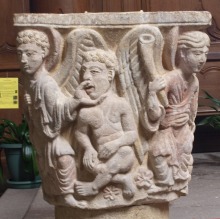 Les Atlantes アトランテを描くこの柱頭は、古代ローマより直接着想を得たものです。植物の中で、4人の裸の若者が膝をついて松かさやブドウの房を掴んでいます。 Ce chapiteau s'inspire directement de l'Antiquité. Parmi des feuillages, quatre éphèbes (jeunes hommes) nus, à genoux, tiennent des pommes de pin et des grappes de raisin. |