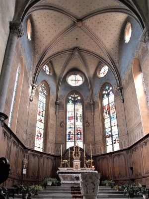 | Choeur 地震の後に15世紀にゴシック・スタイルで再建された多角形プランの内陣は、オジーヴ・ヴォールトに覆われており、5つの縦長のトレーサリーがある開口部から光が入ります。各開口部の上にはオクルスが穿たれています。 Reconstruit en style gothique au 15e siècle, après les tremblements de terre, le choeur polygonal, voûté d'ogives, est éclairé par cinq hautes baies à remplage, chacune surmontée d'un oculus. 現在の内陣は、ロマネスクのサンクチュアリよりかなり小さくなっています。ロマネスクの内陣は、4つの半円プランの放射状祭室がある周歩廊に囲まれていました。 L'actuel choeur est bien plus réduit que le sanctuaire roman : le choeur roman était entouré d'un déambulatoire à quatre chapelles rayonnantes en hémicycle. 内陣の下には、カロリング朝時代に遡るクリプトが残ります。 Au-dessous du choeur se trouve une crypte de l'époque carolingienne. |