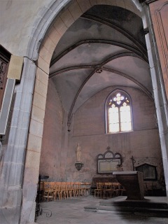 Transept トランセプトは一連の地震後、15世紀にほぼ全面的に再建されました。 翼廊は2ベイで、オジーヴ・ヴォールトに覆われています。後陣祭室は再建されませんでした。尚、北側後陣の基礎部分は1981年に発見されています。 Le transept a été presque entièrement reconstruit au 15e siècle, à la suite d'une série de tremblements de terre. Les croisillons de deux travées sont couverts de voûtes d'ogives. Les absidioles orientées n'ont été jamais reconstituées : les fondations de l'absidiole nord ont été découvertes en 1981. 北翼廊にある祭壇飾りの中央に、恐らく12世紀に制作された金銀で装飾されたキリスト磔刑像があります。 Dans le croisillon nord, le retable abrite en son centre un crucifix argenté et doré, probablement réalisé au 12e siècle. 南翼廊は、かつて回廊に通じる入り口を備えていました。これは修道士専用の教会堂への入り口でしたが、今日は塞がれています。それでもこの入り口の外側には、ロマネスクの時代に遡る彫刻装飾が施されたリンテルが残ります。 Le croisillon sud s'ouvrait autrefois sur le cloître par une porte, ancienne entrée de l'église réservée aux moines, aujourd'hui murée. Elle conserve toutefois, sur sa face extérieure, un linteau sculpté de l'époque romane. |