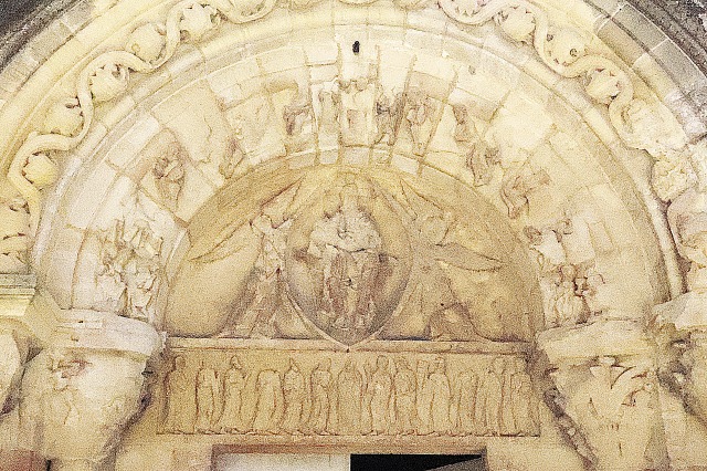 | Le tympan est encadré d'une large archivolte en plein cintre, dont la double voussure retombe, de part et d'autre, sur deux colonnes coiffées de chapiteaux. La voussure externe, ornée d'un décor végétal, a été largement refaite au début du 20e siècle. Celle interne accueille des dix-neuf vieillards de l'Apocalypse selon saint Jean, tandis que les cinq autres sont figurés sur les quatre chapiteaux des colonnes recevant les voussures. Ceints de la couronne et barbus, ils tiennent une coupe et un instrument à cordes rappelant la citole, et glorifient le Christ ressuscité. |