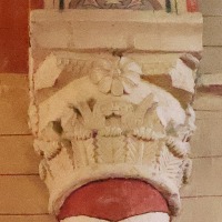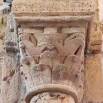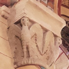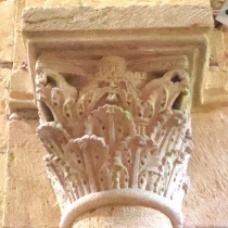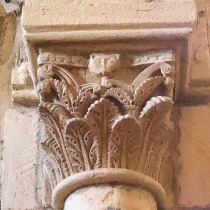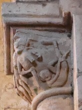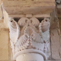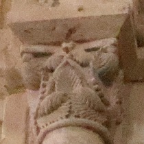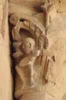 Chapiteaux sculptés ヴシュールを受ける柱頭はかなり損傷を受けていますが、それでも黙示録の長老を描いた2人の人物の姿を判別することができます。 Recevant les voussures, les quatre chapiteaux sont très endommagés. Néanmoins, deux figures représentant des vieillards de l'Apocalypse y demeurent identifiables. |