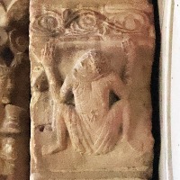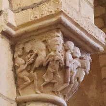 | 右の柱頭は、解釈が非常に困難ですが、一人の人物が頭・手首・足首を縄で縛られ宙づりにされており、もう一人の人物は自分の喉に短剣を突き刺しています。 Sur le chapiteau de droite, dont l'interprétation demeure délicate, un personnage est suspendu dans les airs, la tête, les poignets et les pieds liés par une corde, tandis qu'un autre s'enfonce un poignard dans la gorge. |