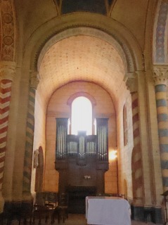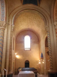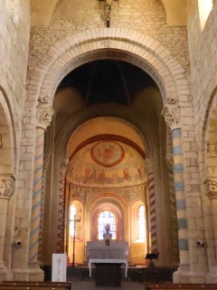 Choeur 内陣は1080年代に遡り、長方形プランの1ベイとアプスで構成されます。 建物はクリュニーUにインスパイアされたベネディクト会スタイルのプランを採用しており、内陣の両脇には東側が後陣祭室になっている側廊があり、また、内陣のアプスの東側にも小さな中央後陣祭室があります。翼廊に開かれる2つの後陣祭室とをあわせると、5つの後陣祭室が階段状に連なる構造となっています。 Le choeur, daté des années 1080, se compose d'une travée rectangulaire se terminant par une abside. Adoptant le plan bénédictin inspiré de Cluny II, le chevet présente, de part et d'autre du choeur, des collatéraux qui s'achèvent chacun par une absidiole, tandis que l'abside se prolonge par une petite absidiole axiale. Avec les deux autres absidioles greffées sur les croisillons, l'ensemble forme ainsi un dispositif de cinq absidioles échelonnées. 主祭壇が置かれた内陣のベイは円筒型のヴォールトに覆われ、柱頭を戴く付柱に繋がる半円型のアーケードで側廊と繋がっています。 Abritant le maître-autel, la travée de choeur, voûtée en berceau, communique avec les collatéraux par des arcades en plein cintre retombant sur des colonnes engagées à chapiteaux. 2つの半円型の開口部から採光するアプスはセミ・ドームで覆われ、上部にはピラスター状の縦帯の上にロンバルディア帯状の小さな連続アーチが巡らされています。 Eclairée par deux baies en plein cintre, l'abside en cul-de-four est ornée, dans sa partie supérieure, d'arcatures lombardes sur des lésènes. |