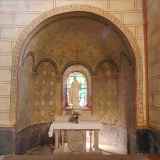 Transept 11世紀に造られたトランセプトは張り出していて、身廊より高さが低い造りになっています。 翼廊は円筒型のヴォールトに覆われ、妻壁に穿たれた大きな半円型の開口部より採光します。翼廊は東側にそれぞれ後陣祭室があり、西側には半円型のアーケードで側廊と繋がっています。 トランセプトの壁画は、2022年に修復されました。 Datant de la fin du 11e siècle, le transept saillant est moins élevé que la nef. Voûtés en berceau, les croisillons reçoivent chacun la lumière par une grande baie en plein cintre percée dans le mur-pignon. Ils s'ouvrent sur les absidioles orientées et communiquent, à l'ouest, avec les bas-côtés par de basses arcades en plein cintre. Les peintures murales du transept ont été restaurées en 2022. 西側に入り口が設けられた北翼廊には、2008年に制作されたモザイクがあります。 北翼廊と北側廊とを繋ぐアーケードのキーストーンに、小さな聖母マリアの母子像があります。 S'ouvrant, du côté occidental, par une porte aujourd'hui fermée, le croisillon nord renferme une mosaïque réalisée en 2008. L'arcade qui le relie au bas-côté nord porte, sur sa clef d'arc, une petite Vierge à l'Enfant. |