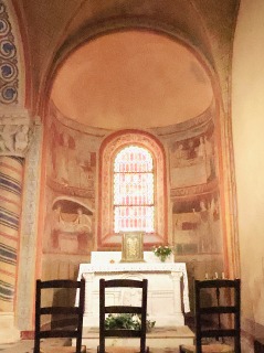 | Fresques de l'abside et des absidioles アプスとアプスを取り囲む後陣祭室は、12世紀に制作されたロマネスクのフレスコ画で装飾されています。これらの壁画は1850年に漆喰の下から発見され、1857年に修復され、一部大幅な描き直しも行われ、そして2017年に改めて再度修復されました。 L'abside et les trois absidioles qui l'entourent sont ornées de fresques romanes du 12e siècle. Redécouvertes sous un badigeon en 1850, elles ont été restaurées - parfois même largement reprises - en 1857, puis à nouveau restaurées en 2017. |