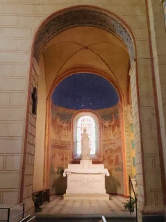 Vestiges des fresques クリプトはかつては壁画で装飾されていましたが、今日は北側廊に断片が残るのみです。これは修道士、恐らく聖ベネディクトゥスの頭部を描いたもので、制作時期は12世紀とも14世紀ともいわれています。 La crypte était autrefois ornée de peintures murales, dont il ne subsiste qu'un seul fragment sur le mur du bas-côté nord : le buste d'un moine, probablement saint Benoît, daté du 12e siècle selon certains, ou du 14e selon d'autres. 左は北側の側廊と後陣祭室のイメージです。 |