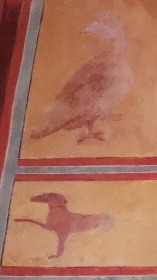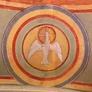 Absidiole axiale アプスの東側にある小さな中央後陣祭室には、半円型の開口部がひとつ穿たれています。この祭室の配置は珍しいものです。また、開口部の周りには動物が描かれています。 Prolongeant l'abside, la petite absidiole axiale, disposition rare, est percée d'une baie en plein cintre, encadrée de peintures représentant des animaux. 中央後陣祭室の壁画は、聖ベネディクトゥス及び聖マウルスの生涯、聖マウルスが聖ベネディクトゥスに奉献される場面、聖ゲルマヌスが聖ベネディクトゥスに顕現する場面が観察されます。 4つの場面の上には、2人の聖人と2人の天使が描かれています。 ヴォールトには三位一体の鳩が描かれています。 Les peintures murales de l'absidiole d'axe illustrent la vie de saint Benoît, celle de saint Maur, l'oblation de saint Maur à saint Benoît, ainsi que l'apparition de saint Germain à saint Benoît. Au-dessus de ces quatre scènes sont figurés deux saints et deux anges. Sur la voûte apparaît la colombe de la Trinité. |