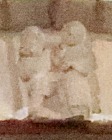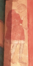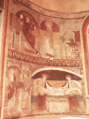 アプスの入り口付近には、丈の短いチュニカを着て、首を垂れて祈るような姿勢をしている2人の人物が描かれています。 A l''entrée de l'abside sont visibles deux personnages vêtus de tuniques courtes, la tête inclinée dans une posture évoquant la prière. |