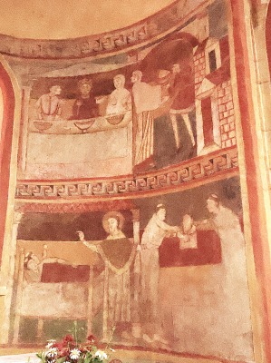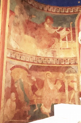 | アプスのセミ・ドームの壁画は、キリスト昇天を描いており、2人の天使に囲まれてマンドルラの中でキリストが祝福を施しています。キリストの足元には、12使徒と3人の聖女の姿があります。 |